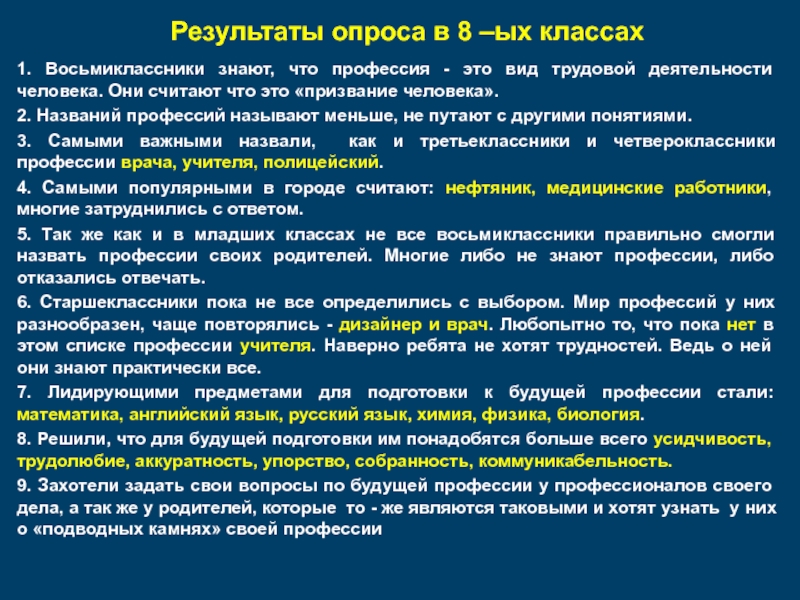 8. Выбирая человеческие качества для подготовки к будущей профессии, ребята назвали такие, как интеллект, аккуратность, ответственность, усидчивость, но есть дети которые не смогли ответить на эти вопросы.