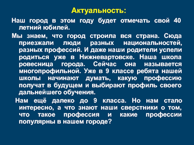 Мы знаем, что город строила вся страна. Сюда приезжали люди разных национальностей, разных профессий. И даже наши родители успели родиться уже в Нижневартовске. Наша школа ровесница города. Сейчас она называется многопрофильной. Уже в 9 классе ребята нашей школы начинают думать, какую профессию получат в будущем и выбирают профиль своего дальнейшего обучения.