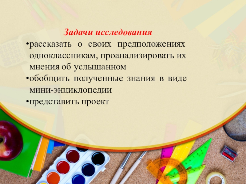 Задачи исследованиярассказать о своих предположениях одноклассникам, проанализировать их мнения об услышанном обобщить полученные знания в виде мини-энциклопедиипредставить