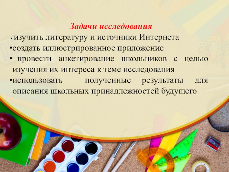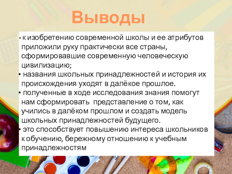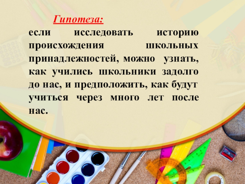 Гипотеза: если исследовать историю происхождения школьных принадлежностей, можно узнать, как учились школьники задолго до нас, и предположить, как будут учиться через много лет после нас.