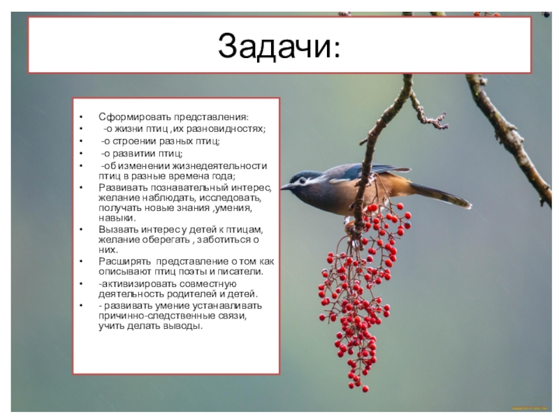 Вызвать интерес у детей к птицам, желание оберегать , заботиться о них.