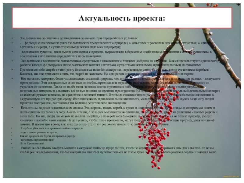 считал необходимым вводить малыша в окружающий мир природы так, чтобы каждый день он открывал в нём для себя что- то новое, чтобы рос исследователем, чтобы каждый его шаг был путешествием к истокам чудес в природе, облагораживал сердце и закалял волю.