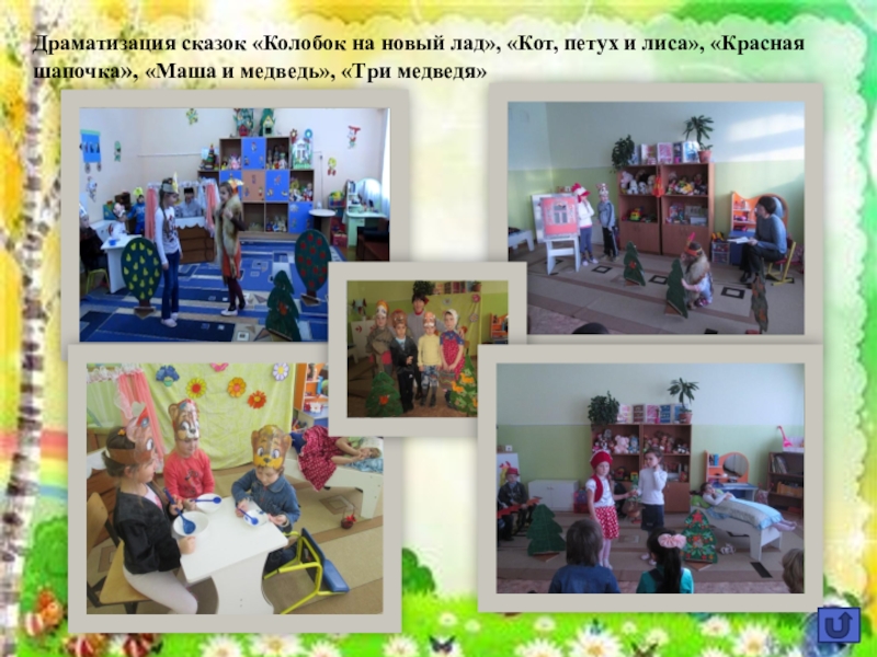 Слайд 19Драматизация сказок «Колобок на новый лад», «Кот, петух и лиса», «Красная