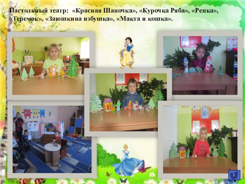 Слайд 24Настольный театр: «Красная Шапочка», «Курочка Ряба», «Репка», «Теремок», «Заюшкина избушка», «Макта