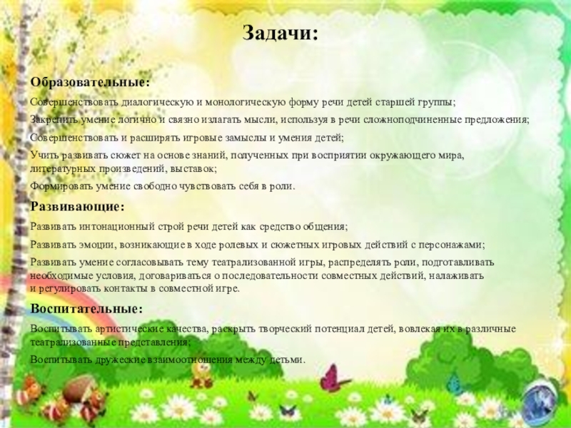 Совершенствовать диалогическую и монологическую форму речи детей старшей группы;
