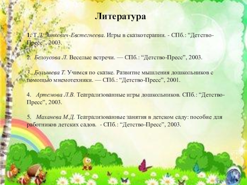 1. Т.Д. Зинкевич-Евстегнеева. Игры в сказкотерапии. - СПб.: “Детство-Пресс”,