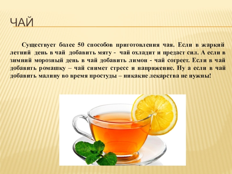 летний день в чай добавить мяту - чай охладит и предаст сил. А если в зимний морозный день в чай добавить лимон - чай согреет. Если в чай добавить ромашку – чай снимет стресс и напряжение. Ну а если в чай добавить малину во время простуды – никакие лекарства не нужны!