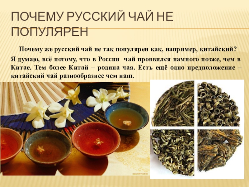 Я думаю, всё потому, что в России чай проявился намного позже, чем в Китае. Тем более Китай – родина чая. Есть ещё одно предположение – китайский чай разнообразнее чем наш.