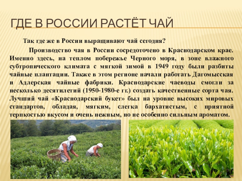 Производство чая в России сосредоточено в Краснодарском крае. Именно здесь, на теплом побережье Черного моря, в зоне влажного субтропического климата с мягкой зимой в 1949 году были разбиты чайные плантации. Также в этом регионе начали работать Дагомысская и Адлерская чайные фабрики. Краснодарские чаеводы смогли за несколько десятилетий (1950-1980-е гг.) создать качественные сорта чая. Лучший чай «Краснодарский букет» был на уровне высоких мировых стандартов, обладая, мягким, слегка бархатистым, с приятной терпкостью вкусом и очень нежным, но не особенно сильным ароматом.
