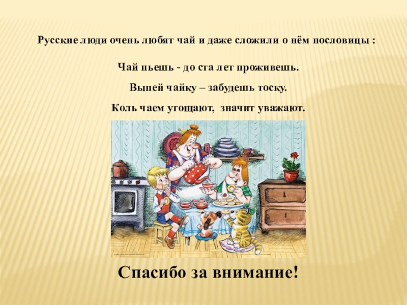 Слайд 13Русские люди очень любят чай и даже сложили о нём пословицы