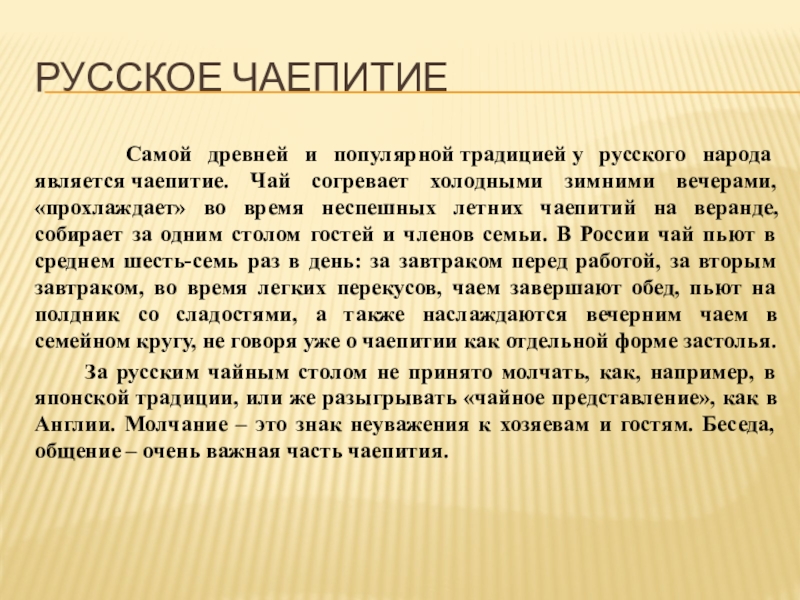 Чай согревает холодными зимними вечерами, «прохлаждает» во время неспешных летних чаепитий на веранде, собирает за одним столом гостей и членов семьи. В России чай пьют в среднем шесть-семь раз в день: за завтраком перед работой, за вторым завтраком, во время легких перекусов, чаем завершают обед, пьют на полдник со сладостями, а также наслаждаются вечерним чаем в семейном кругу, не говоря уже о чаепитии как отдельной форме застолья.