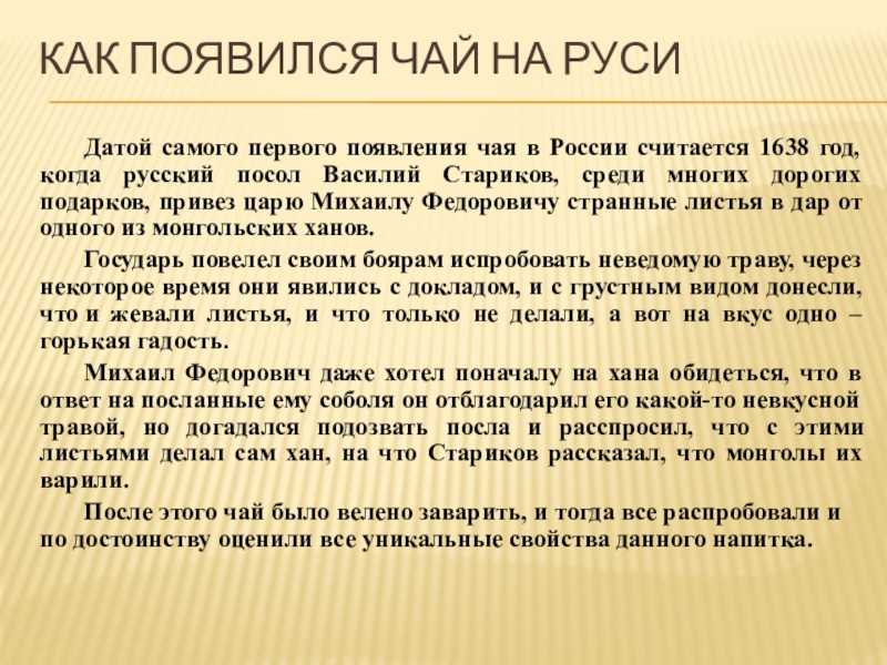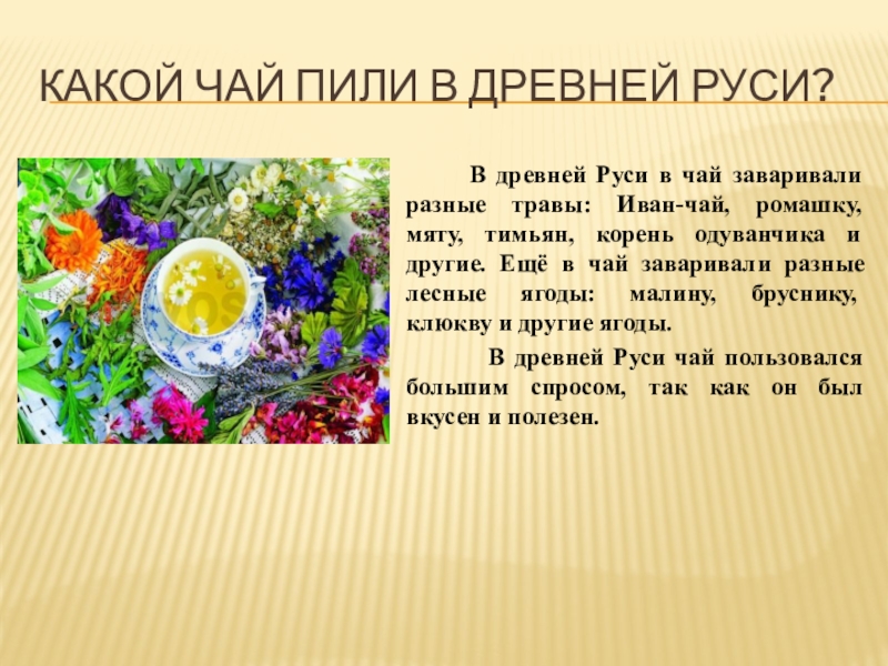 В древней Руси чай пользовался большим спросом, так как он был вкусен и полезен.
