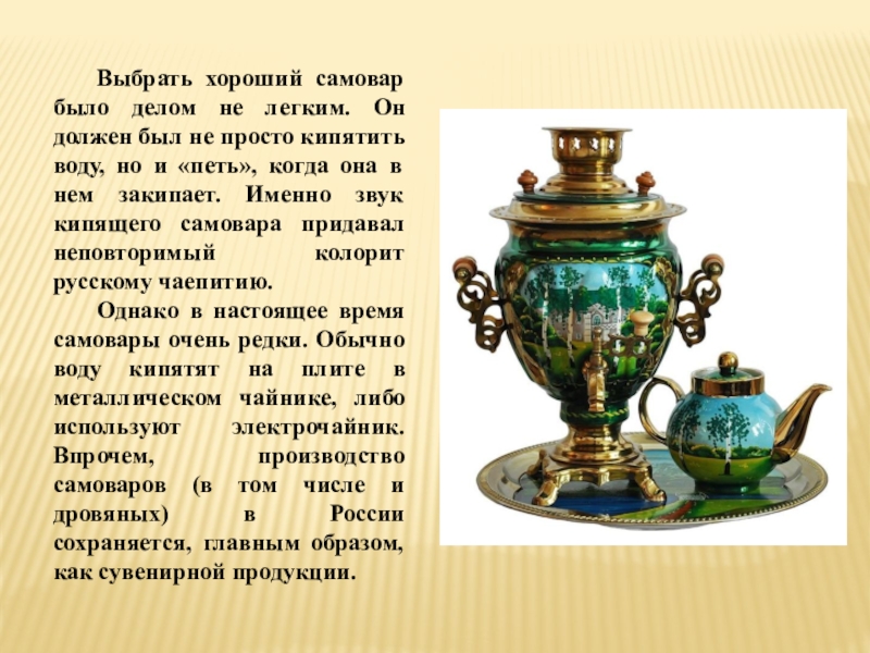 Слайд 10 Выбрать хороший самовар было делом не легким. Он должен был не