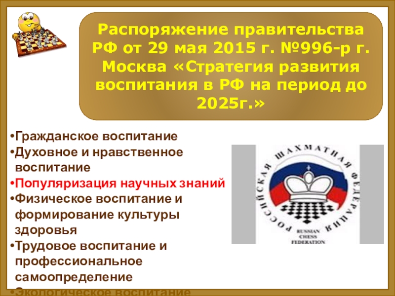 Распоряжение правительства РФ от 29 мая 2015 г. №996-р г. Москва «Стратегия развития воспитания в РФ на период до 2025г.»