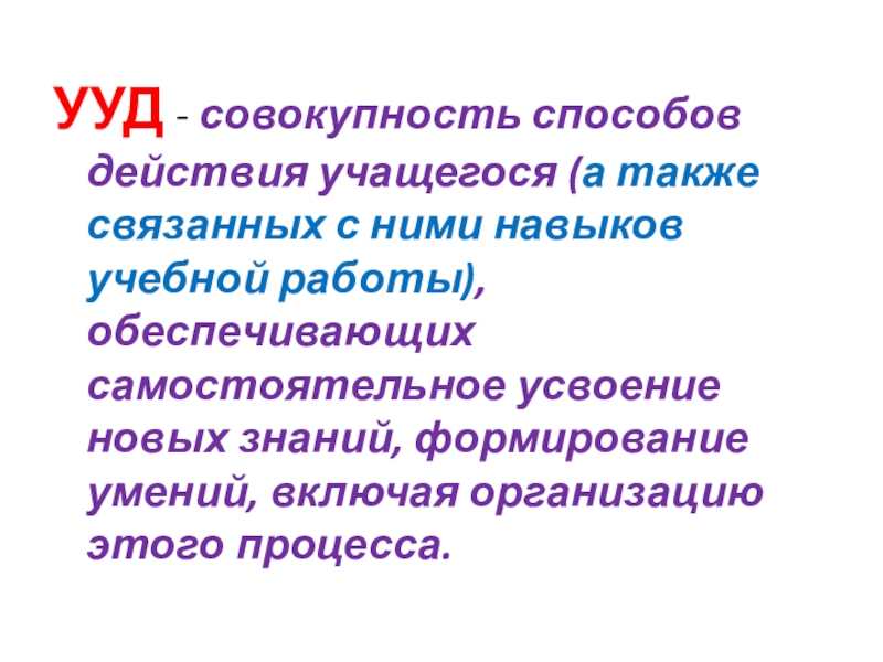 Слайд 5УУД - совокупность способов действия учащегося (а также связанных с ними