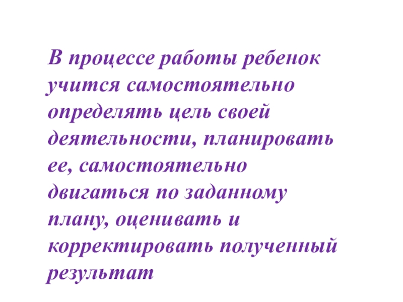 Слайд 23В процессе работы ребенок учится самостоятельно определять цель своей деятельности, планировать