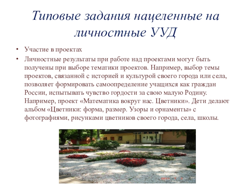 проектами могут быть получены при выборе тематики проектов. Например, выбор темы проектов, связанной с историей и культурой своего города или села, позволяет формировать самоопределение учащихся как граждан России, испытывать чувство гордости за свою малую Родину. Например, проект «Математика вокруг нас. Цветники». Дети делают альбом «Цветники: форма, размер. Узоры и орнаменты» с фотографиями, рисунками цветников своего города, села, школы.