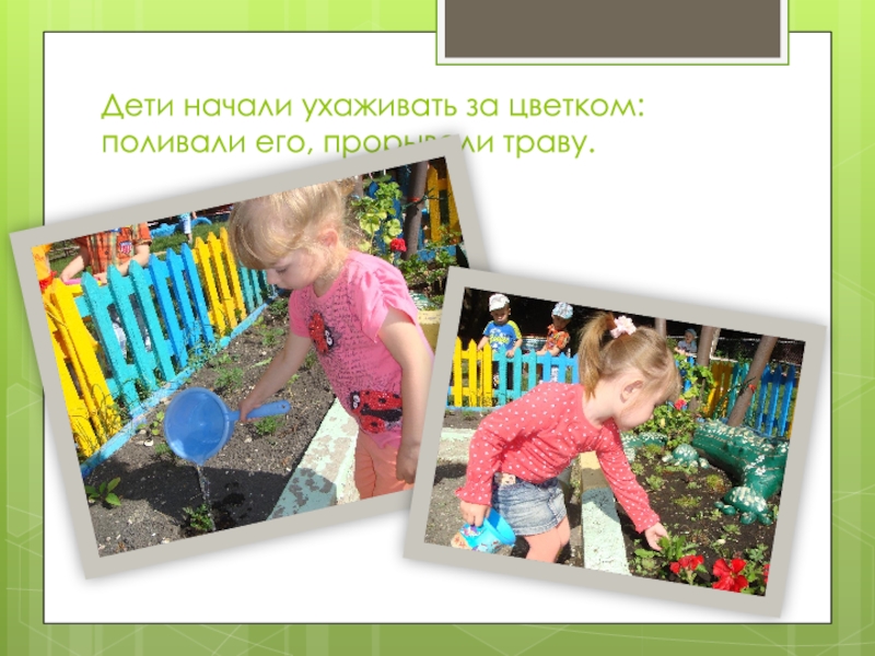 Слайд 10Дети начали ухаживать за цветком: поливали его, прорывали траву.