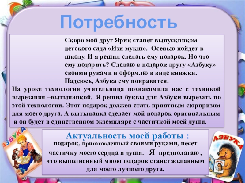 подарок, приготовленный своими руками, несет частичку моего сердца и души. Я предполагаю , что выполненный мною подарок станет желанным для моего лучшего друга.