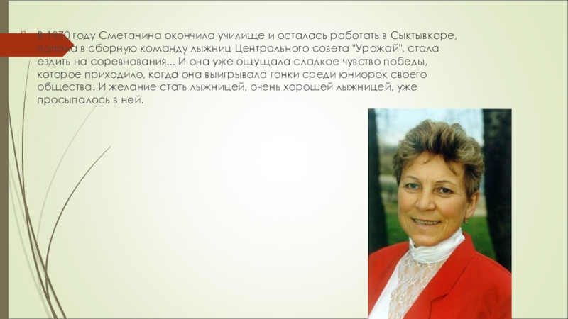 В 1970 году Сметанина окончила училище и осталась работать в Сыктывкаре,