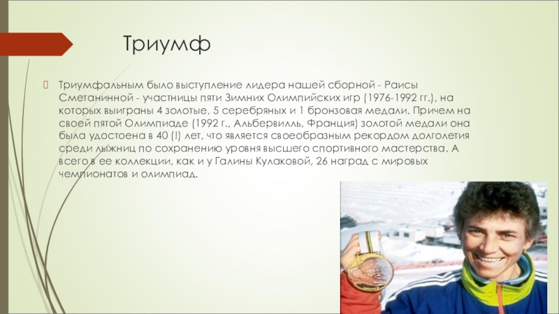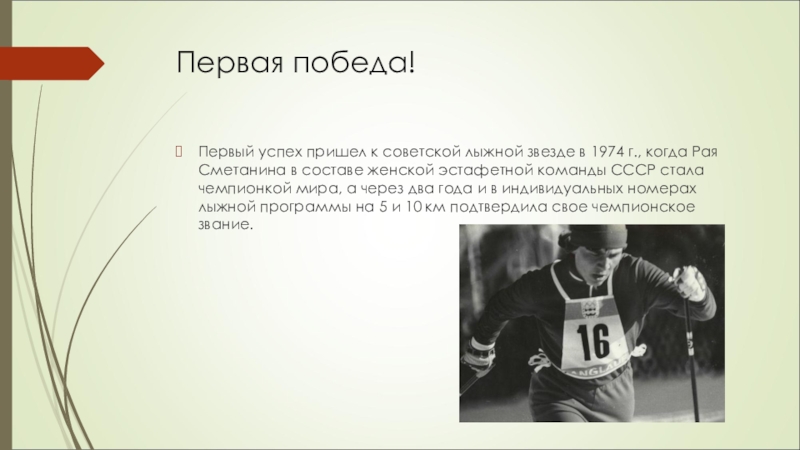 когда Рая Сметанина в составе женской эстафетной команды СССР стала чемпионкой мира, а через два года и в индивидуальных номерах лыжной программы на 5 и 10 км подтвердила свое чемпионское звание.