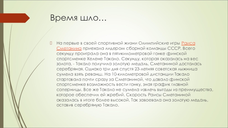сборной команды СССР. Всего секунду проиграла она в пятикилометровой гонке финской спортсменке Хелене Такало. Секунду, которая оказалась на вес золота, - Такало получила золотую медаль, Сметаниной досталась серебряная. Однако три дня спустя 23-летняя советская лыжница сумела взять реванш. На 10-километровой дистанции Такало стартовала почти сразу за Сметаниной, что давало финской спортсменке возможность вести гонку, зная график главной соперницы. Все же Такало не сумела извлечь выгоды из преимущества, которое обеспечил ей жребий. Скорость Раисы Сметаниной оказалась в итоге более высокой. Так завоевала она золотую медаль, оставив серебряную Такало.