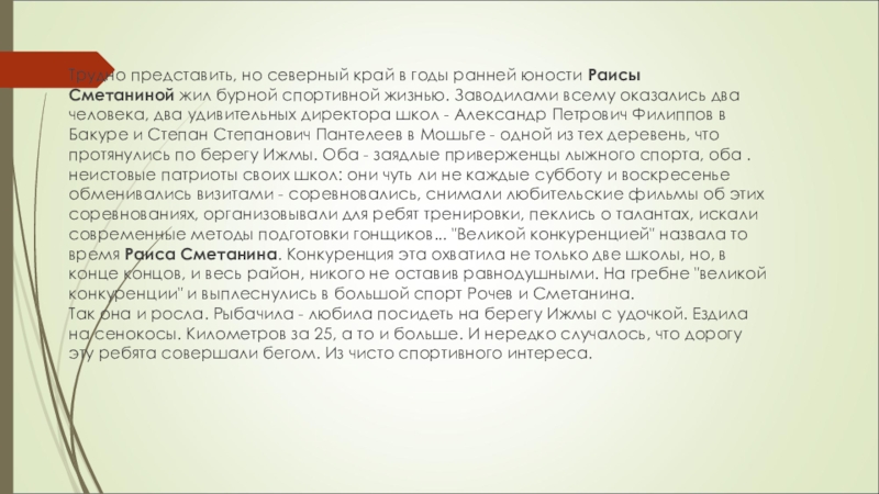 спортивной жизнью. Заводилами всему оказались два человека, два удивительных директора школ - Александр Петрович Филиппов в Бакуре и Степан Степанович Пантелеев в Мошьге - одной из тех деревень, что протянулись по берегу Ижмы. Оба - заядлые приверженцы лыжного спорта, оба . неистовые патриоты своих школ: они чуть ли не каждые субботу и воскресенье обменивались визитами - соревновались, снимали любительские фильмы об этих соревнованиях, организовывали для ребят тренировки, пеклись о талантах, искали современные методы подготовки гонщиков... "Великой конкуренцией" назвала то время Раиса Сметанина. Конкуренция эта охватила не только две школы, но, в конце концов, и весь район, никого не оставив равнодушными. На гребне "великой конкуренции" и выплеснулись в большой спорт Рочев и Сметанина.