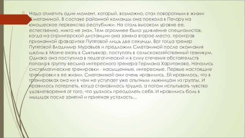 Однако она поступила в педагогический и в силу стечения обстоятельств попала в группу весьма интересного тренера Германа Харитонова. Начались систематические тренировки - насыщенные, интересные. Первые настоящие тренировки в ее жизни. Сметаниной они очень нравились. Ей нравилось, что в тренировках она ни в чем не уступает уже опытным лыжницам из группы. И нравилось потерпеть, когда становилось трудно, а потом испытывать чувство удовлетворения от того, что удалось преодолеть себя. И нравились боль в мышцах после занятий и приятная усталость...