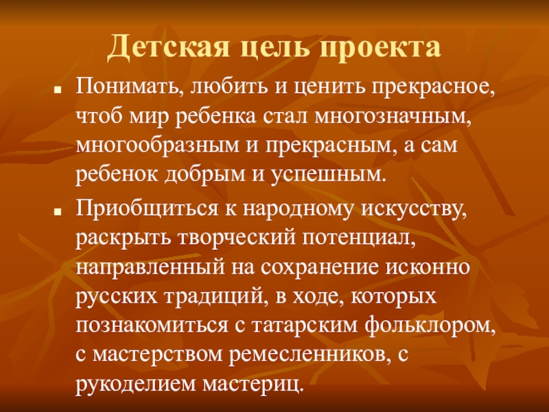 Детская цель проектаПонимать, любить и ценить прекрасное, чтоб мир ребенка стал многозначным, многообразным и прекрасным, а сам