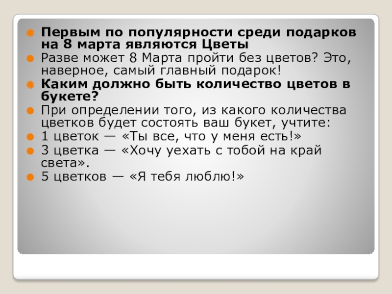 Слайд 16Первым по популярности среди подарков на 8 марта являются Цветы