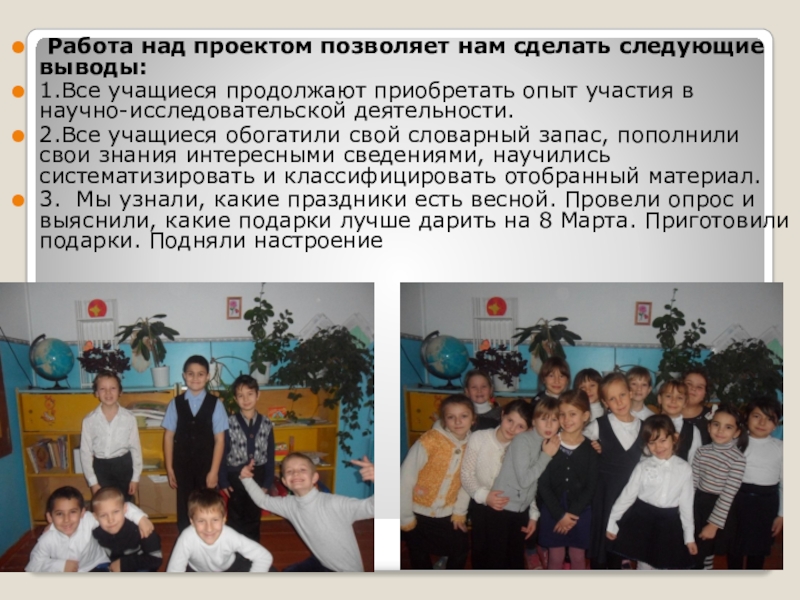 3. Мы узнали, какие праздники есть весной. Провели опрос и выяснили, какие подарки лучше дарить на 8 Марта. Приготовили подарки. Подняли настроение