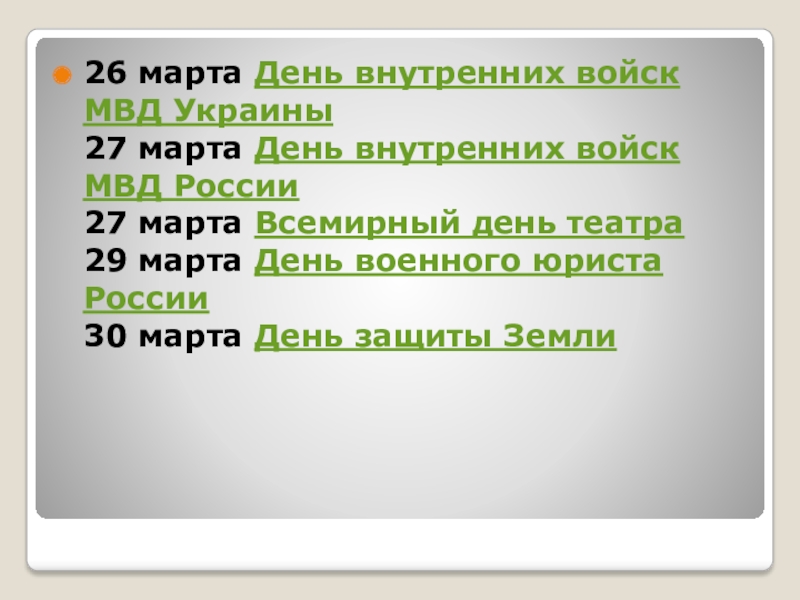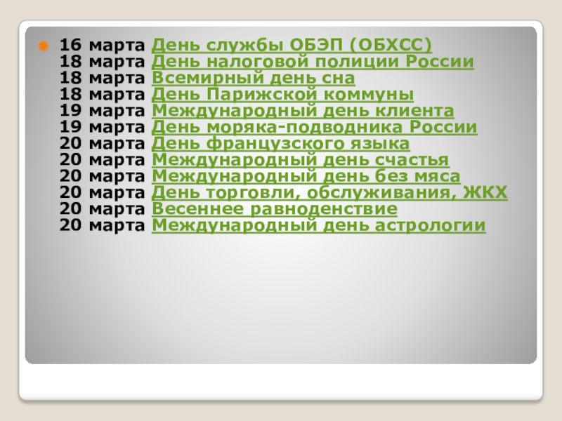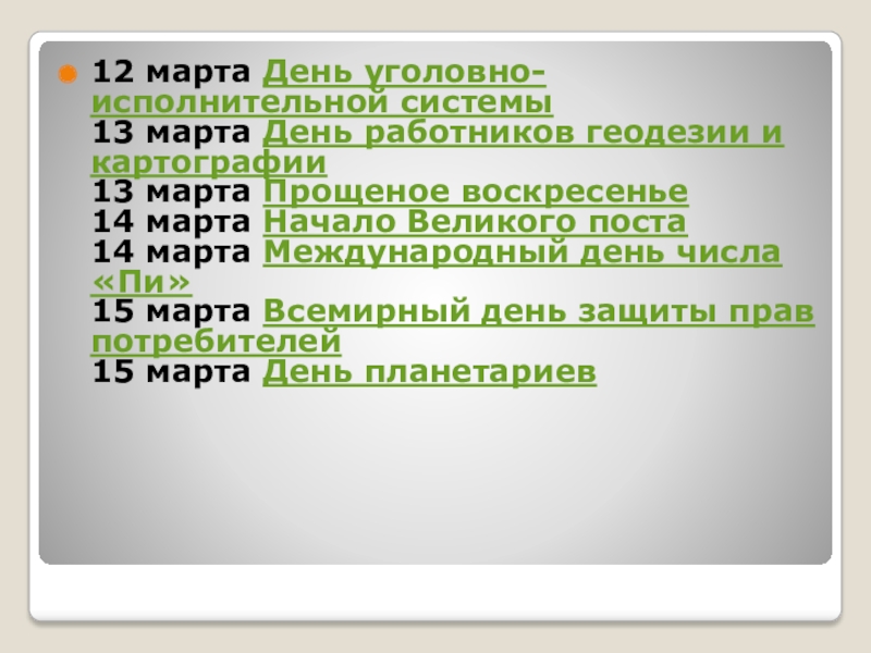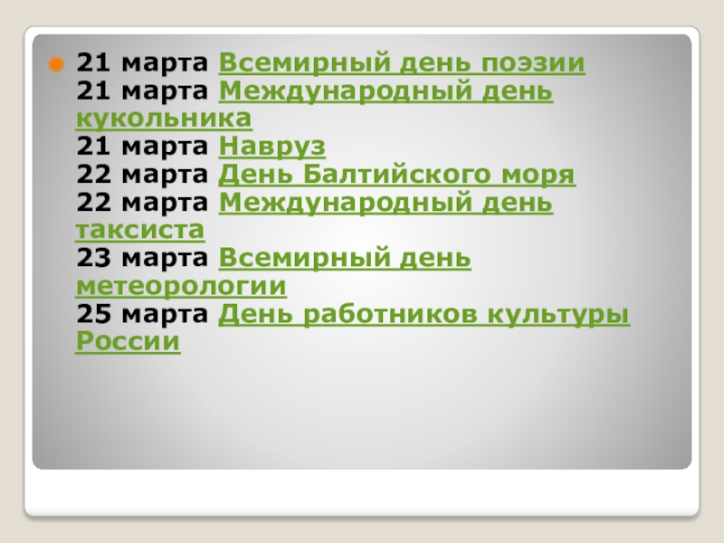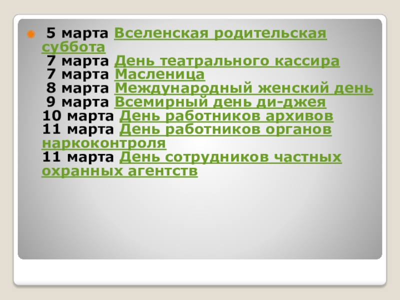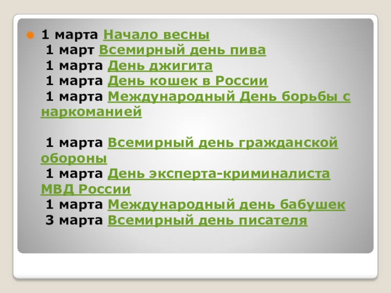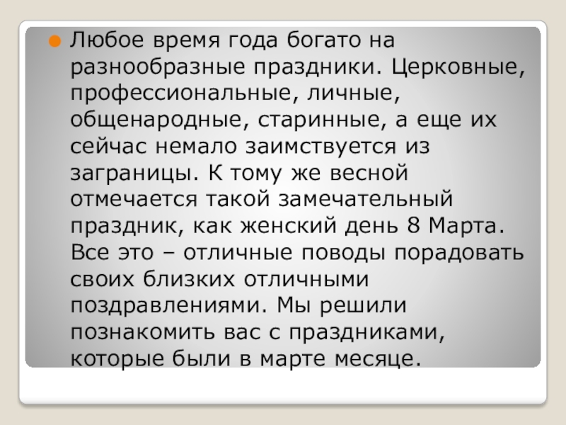 старинные, а еще их сейчас немало заимствуется из заграницы. К тому же весной отмечается такой замечательный праздник, как женский день 8 Марта. Все это – отличные поводы порадовать своих близких отличными поздравлениями. Мы решили познакомить вас с праздниками, которые были в марте месяце.