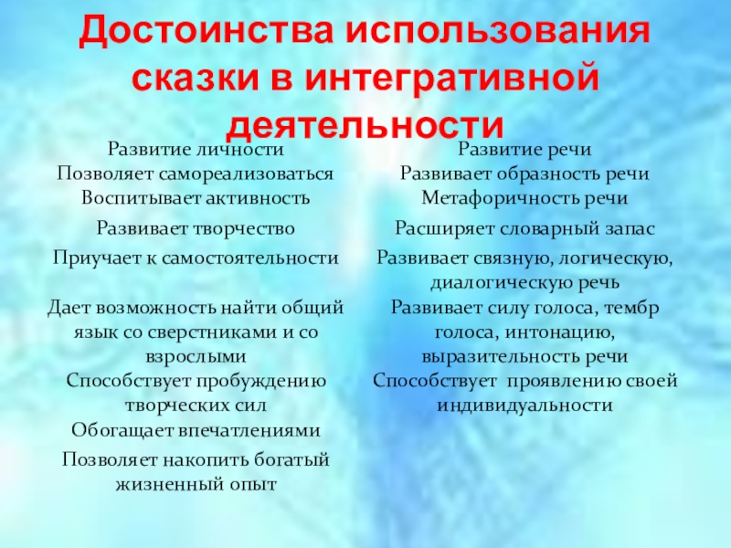 Слайд 7Достоинства использования сказки в интегративной деятельности