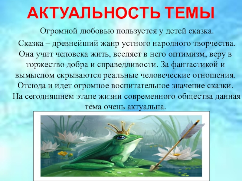 устного народного творчества. Она учит человека жить, вселяет в него оптимизм, веру в торжество добра и справедливости. За фантастикой и вымыслом скрываются реальные человеческие отношения. Отсюда и идет огромное воспитательное значение сказки. На сегодняшнем этапе жизни современного общества данная тема очень актуальна.