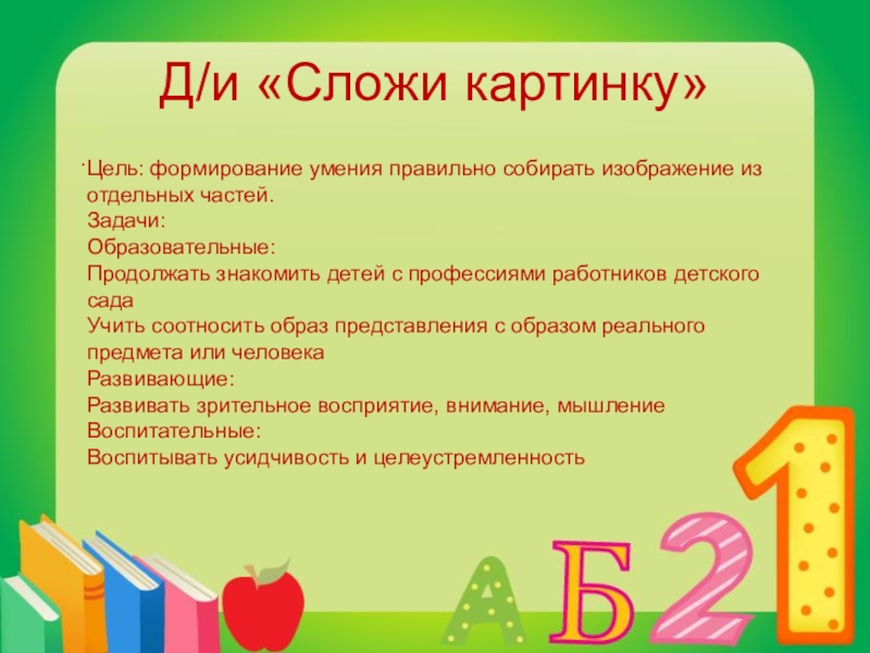 Д/И «Отгадай профессию», « Кому что нужно для работы?», «Сложи картинку»