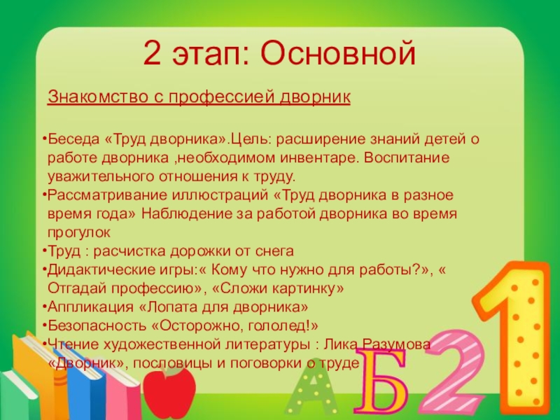 Рассматривание иллюстраций «Труд дворника в разное время года» Наблюдение за работой дворника во время прогулок