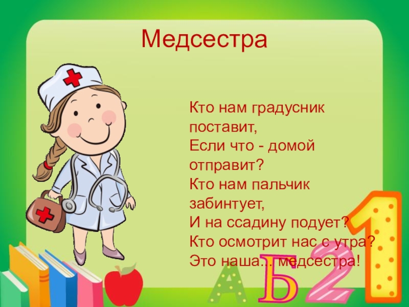 Рассказ медсестры о своей профессии, ее важности и необходимости в детском саду. Рассматривание оборудования медицинского кабинета.