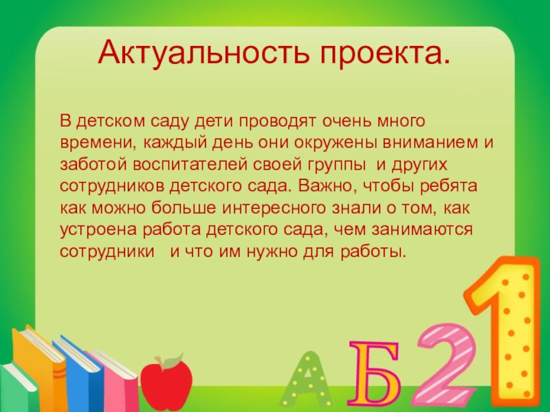 они окружены вниманием и заботой воспитателей своей группы и других сотрудников детского сада. Важно, чтобы ребята как можно больше интересного знали о том, как устроена работа детского сада, чем занимаются сотрудники и что им нужно для работы.