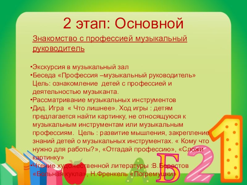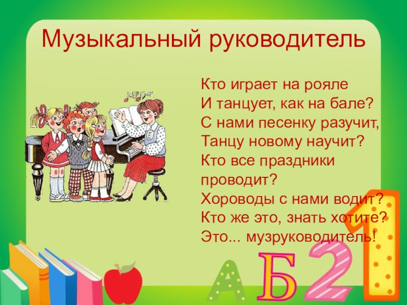 «Профессия –музыкальный руководитель» Цель: ознакомление детей с профессией и деятельностью музыканта.