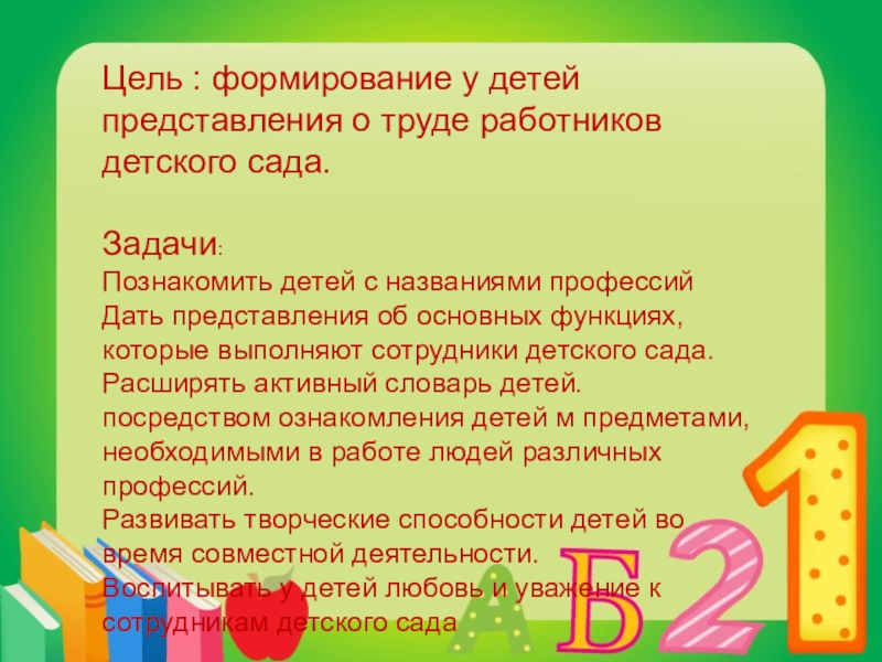 Слайд 4Цель : формирование у детей представления о труде работников детского сада.