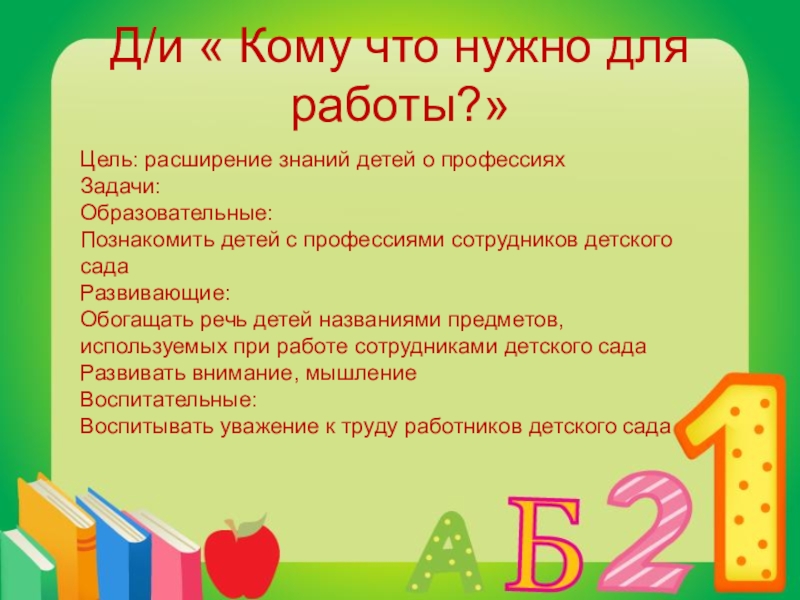 Расширять активный словарь детей. посредством ознакомления детей м предметами, необходимыми в работе людей различных профессий.