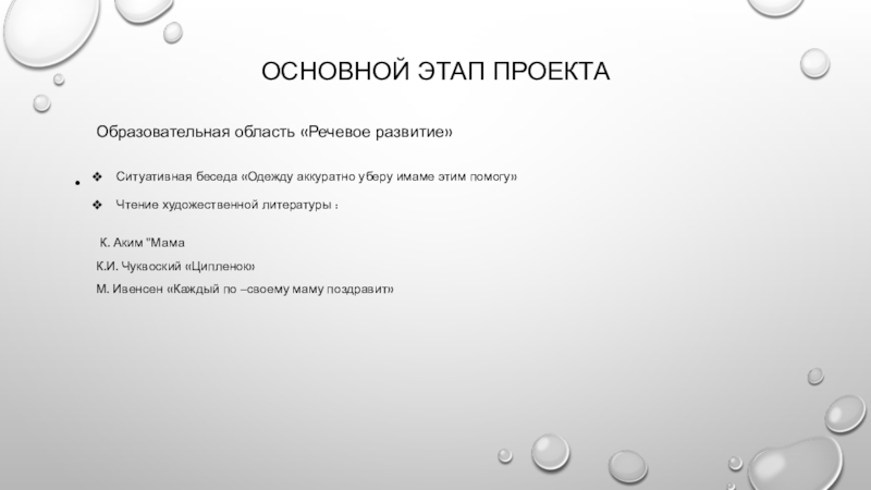 Художественная литература :К. Аким "Мама", М.Ивенсен "Каждый по-своему маму поздравит",И.Мазнин "Простое слово",К. И. Чуковский «Цыплёнок", Е. Благинина. «Посидим в тишине», С.Я.Маршак "Сказка о глупом мышонке«. Потешки «Этот пальчик…», «Сорока ворона…»