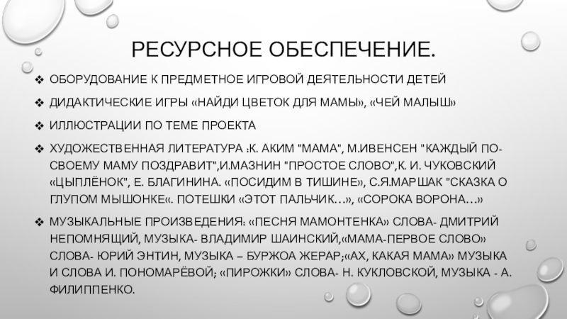Музыкальные произведения: «Песня мамонтенка» слова- Дмитрий Непомнящий, музыка- Владимир Шаинский,«Мама-первое слово» слова- Юрий Энтин, музыка – Буржоа Жерар;«Ах, какая мама» музыка и слова И. Пономарёвой; «Пирожки» слова- Н. Кукловской, музыка - А. Филиппенко.