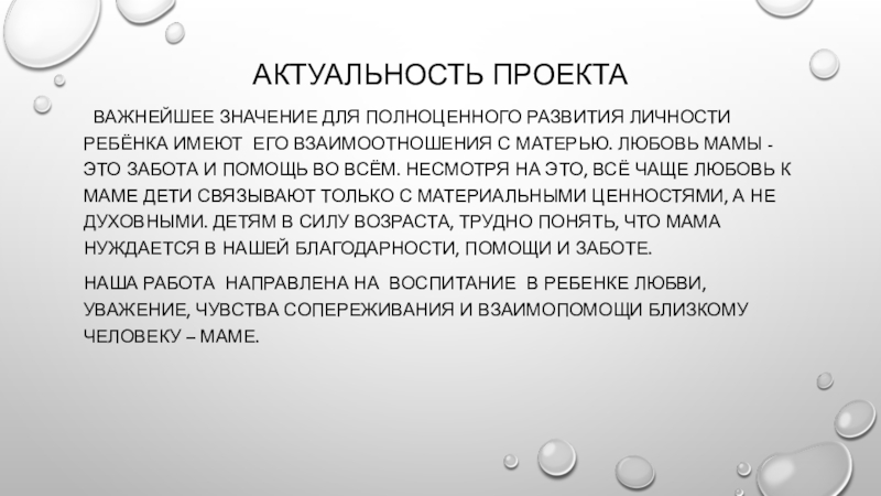 взаимоотношения с матерью. Любовь мамы - это забота и помощь во всём. Несмотря на это, всё чаще любовь к маме дети связывают только с материальными ценностями, а не духовными. Детям в силу возраста, трудно понять, что мама нуждается в нашей благодарности, помощи и заботе.