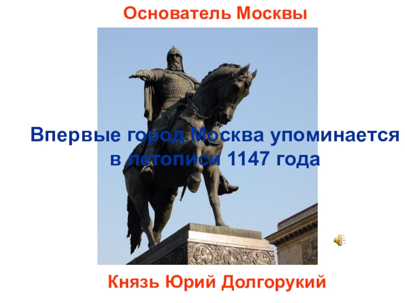 Основатель МосквыКнязь Юрий ДолгорукийВпервые город Москва упоминаетсяв летописи 1147 года