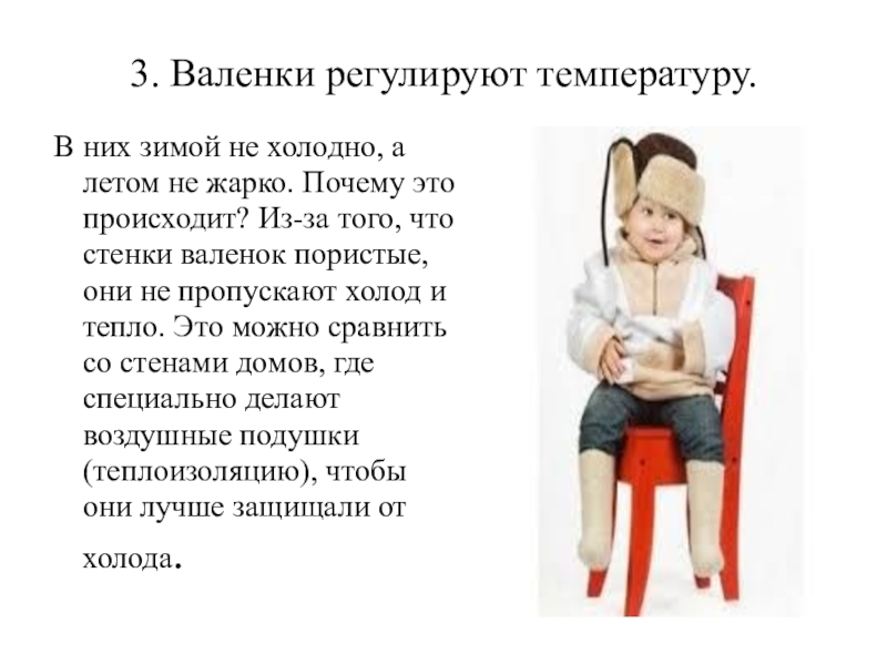 жарко. Почему это происходит? Из-за того, что стенки валенок пористые, они не пропускают холод и тепло. Это можно сравнить со стенами домов, где специально делают воздушные подушки (теплоизоляцию), чтобы они лучше защищали от холода.
