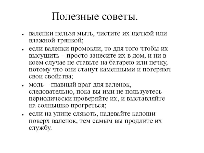 моль – главный враг для валенок, следовательно, пока вы ими не пользуетесь – периодически проверяйте их, и выставляйте на солнышко прогреться;