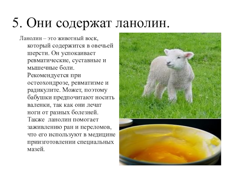 овечьей шерсти. Он успокаивает ревматические, суставные и мышечные боли. Рекомендуется при остеохондрозе, ревматизме и радикулите. Может, поэтому бабушки предпочитают носить валенки, так как они лечат ноги от разных болезней. Также ланолин помогает заживлению ран и переломов, что его используют в медицине приизготовлении специальных мазей.