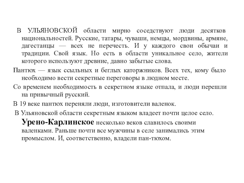 В Ульяновской области секретным языком владеет почти целое село. Урено-Карлинское несколько веков славилось своими валенками. Раньше почти все мужчины в селе занимались этим промыслом. И, соответственно, владели пан-тюхом.