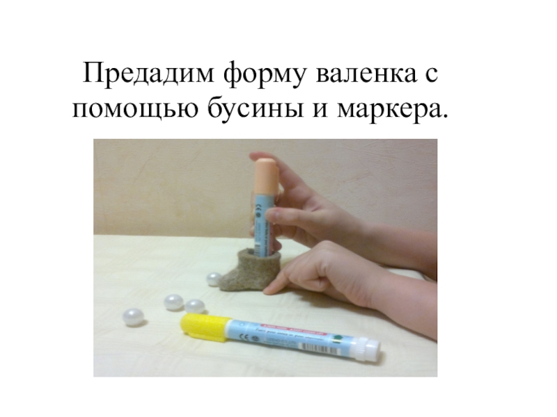 Слайд 23Предадим форму валенка с помощью бусины и маркера.